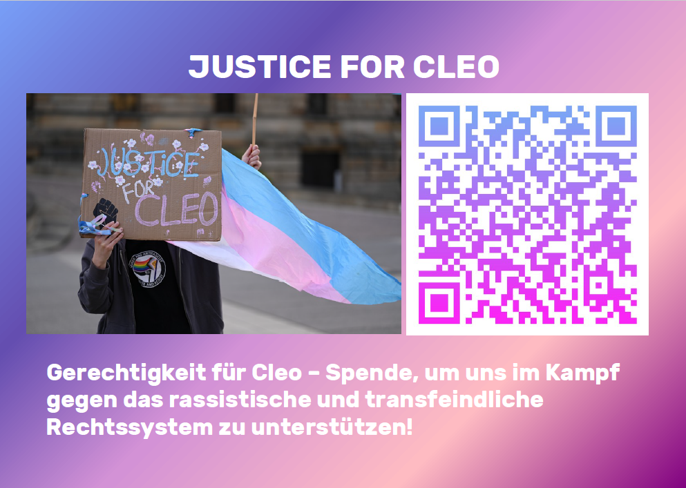 „Gerechtigkeit für Cleo – Spende, um uns im Kampf gegen das rassistische, migrantenfeindliche und transfeindliche Rechtssystem zu unterstützen!