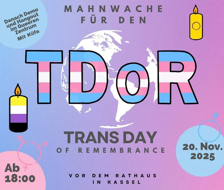 Anlässlich des Gedenktags treffen wir uns um 18 Uhr zu einer Mahnwache an den Stufen des Kasseler Rathauses. Bringt gerne trans* Pride Flaggen und/oder Kerzen mit.